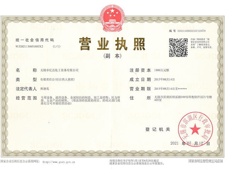 無錫卓億達化工裝備有限公司位于無錫市濱湖區(qū)雪浪鎮(zhèn),生產基地位于無錫宜興市芳橋街道工業(yè)集中區(qū)。